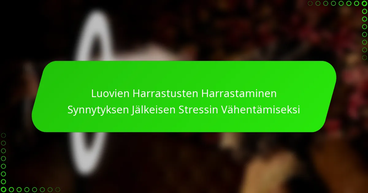Luovat harrastukset voivat merkittävästi lievittää synnytyksen jälkeistä stressiä tarjoamalla emotionaalisen purkautumiskanavan ja saavutuksen tunteen. Taiteelliset aktiviteetit, käsityöt, kirjoittaminen, musiikilliset harrastukset ja digitaalinen luovuus voivat auttaa uusia vanhempia ilmaisemaan tunteitaan ja löytämään iloa prosessista.